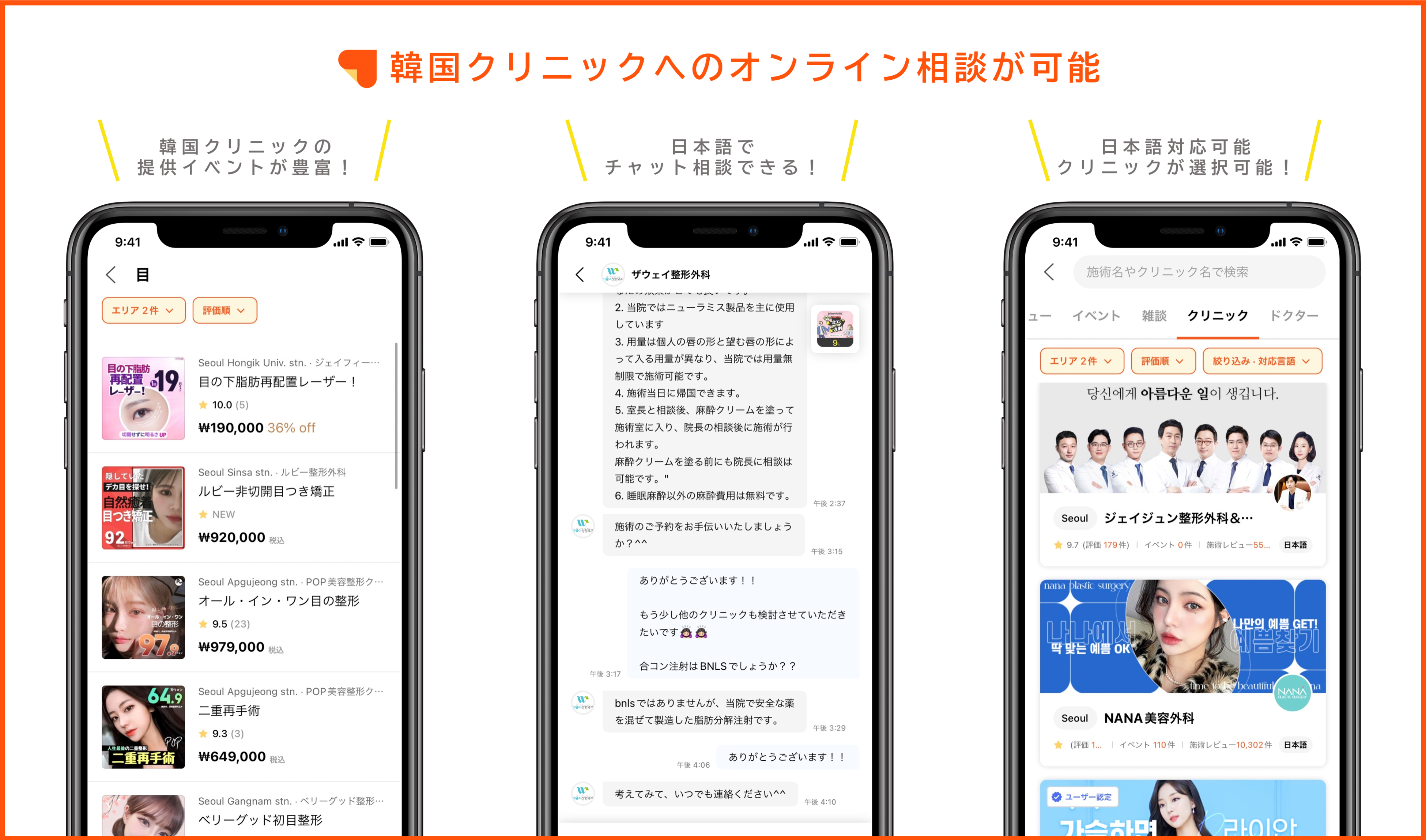 ユーザーは、韓国クリニックの現地での評価・レビューやお得な施術情報を収集し、アプリ内チャットもしくはSNSを通じてクリニックへオンライン相談することが出来ます。また、カンナムオンニでは日本語対応できる韓国クリニックが分かるため、言語に自信がない場合も安心してご利用いただけます。