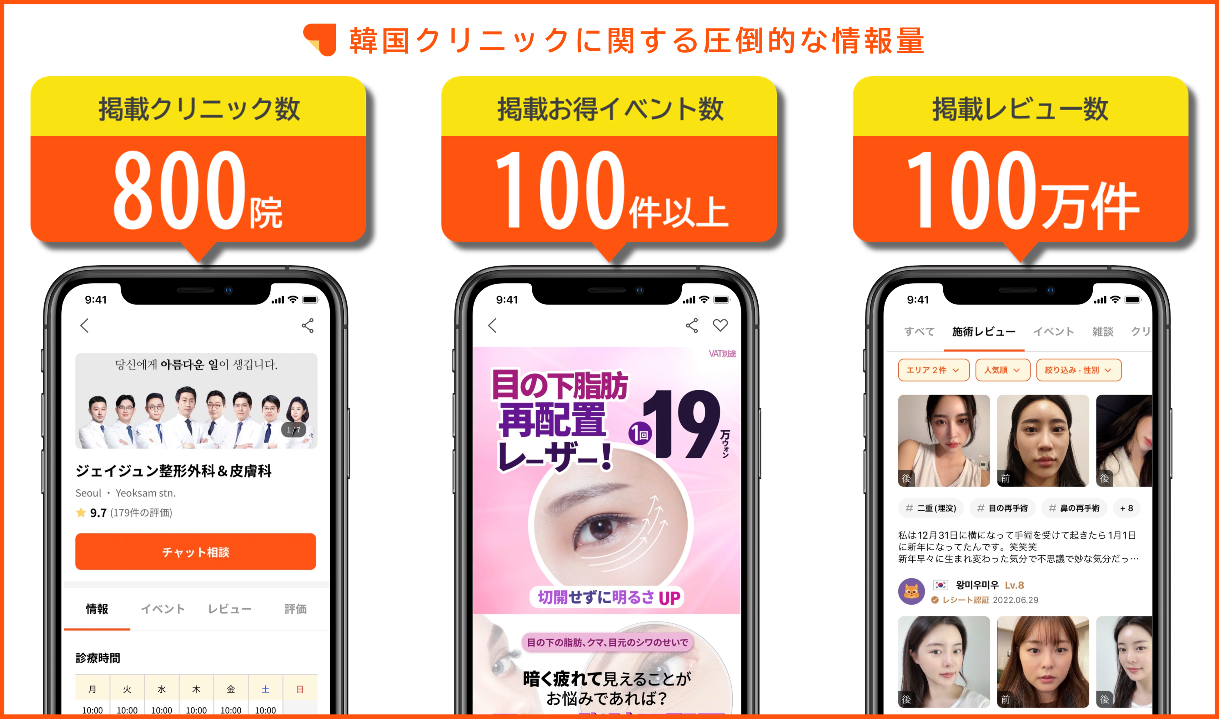 カンナムオンニは21年、韓国にて「美容医療・美容整形領域」にてNo.1アプリに選出されており、情報の量・質、そして信頼性において高い評価をいただいています。日本人ユーザーが韓国クリニックへ来院する上での不安を最大限払拭できるよう、今後も信頼性を第一に韓国クリニックに関する情報を収集してまいります。また、掲載情報はレビュー含め、全て日本語に自動翻訳されており、言語の障壁を感じることなくサービスを閲覧して頂けます。