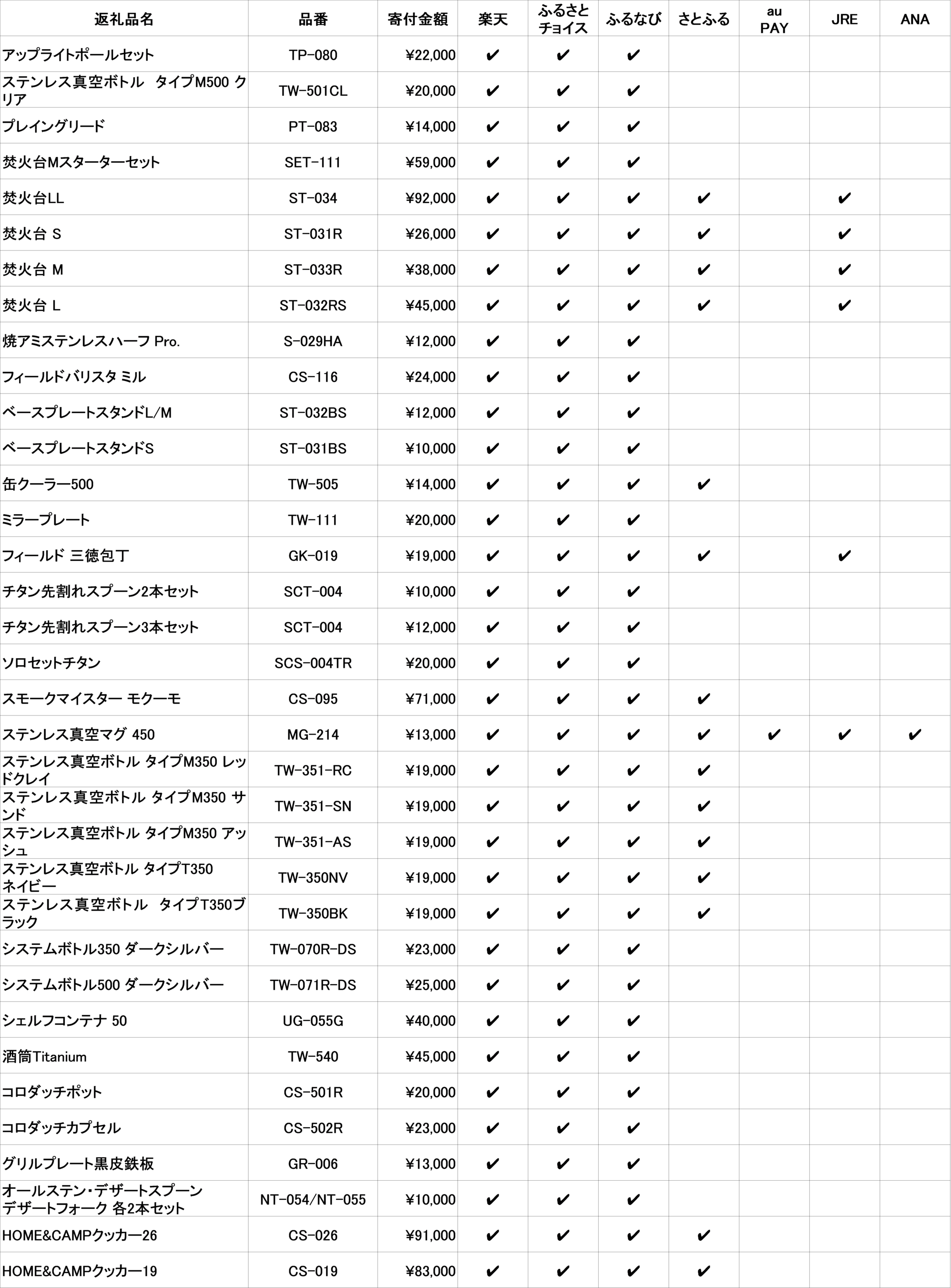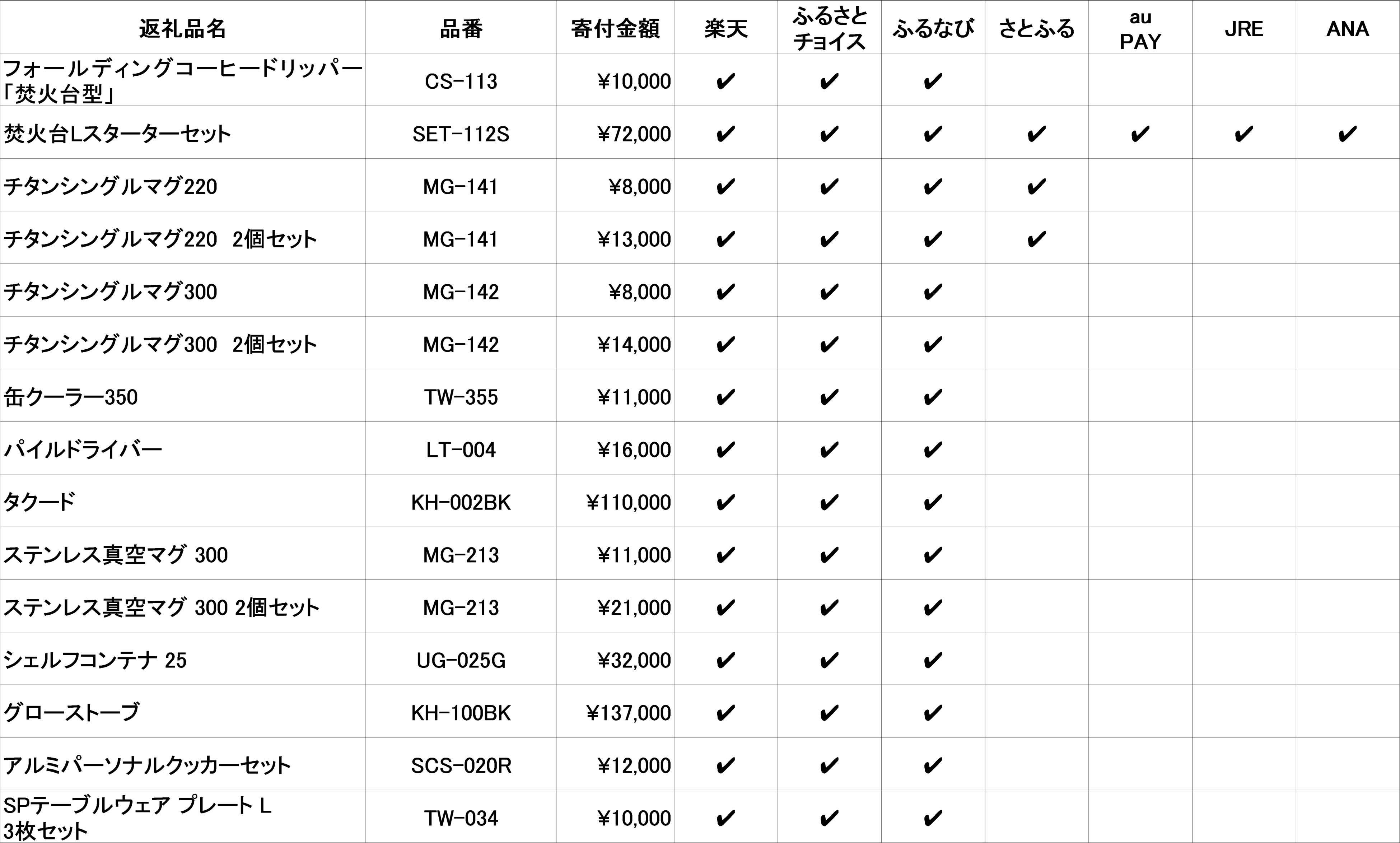 楽天ふるさと納税、ふるさとチョイス、ふるなび、さとふる、JRE MALL ふるさと納税、au PAYふるさと納税、ANAのふるさと納税にて出品の予定です。(別表参照)