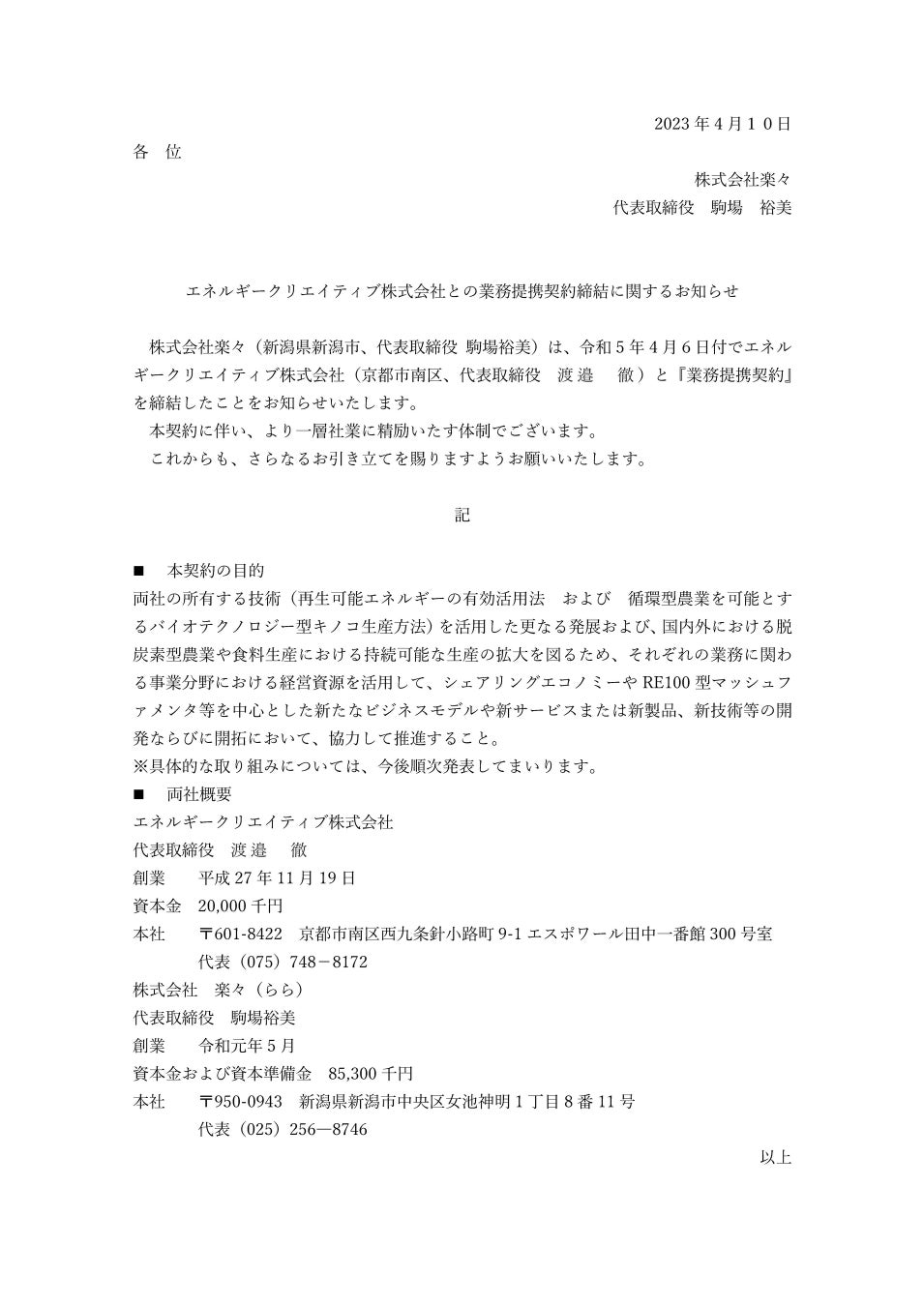 続いて、同年同月6日付でエネルギークリエイティブ株式会社(京都市南区、代表取締役 渡邉徹)と『業務提携契約』を締結いたしました。