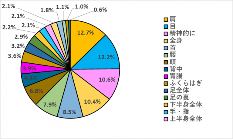 - 疲労を感じる部位は、「肩」が最多