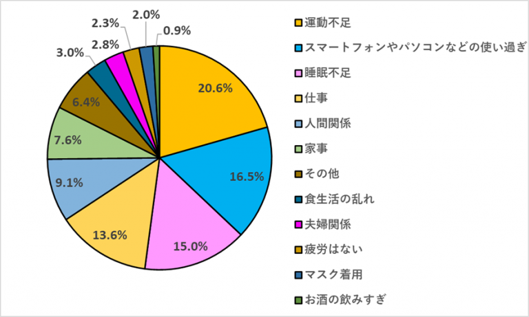 「疲労の原因になっていると思うものは何ですか?」という質問を複数回答可で行ったところ、「運動不足」が20.6%、「スマートフォンやパソコンなどの使い過ぎ」が16.5%、「睡眠不足」が15.0%という順になりました。