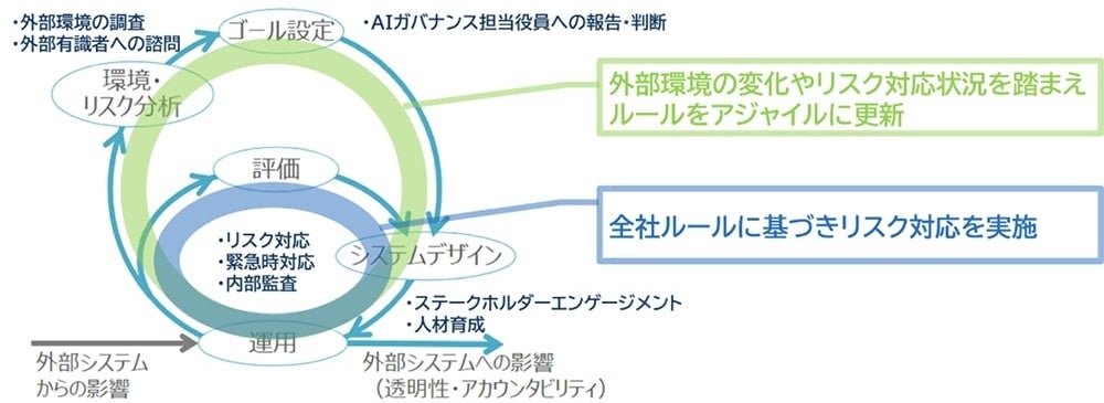 ChatGPTに代表される生成AIの利用可能性やリスクへの注目の高まりなど、AIの実装を巡る議論は常時更新されています。本体制は、こうした環境の変化に迅速に対応できるよう、常に外部環境やリスクを評価し、ガバナンス体制自体を迅速にアップデートできるような「アジャイル・ガバナンス」を実践した取組です。