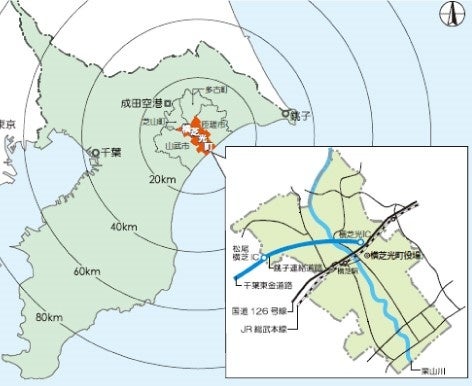 横芝光町は千葉県北東部に位置し、東京から約80分(約70km)、千葉市内から約40分(約35km)、成田国際空港から25分(約20km)の距離にあります。「日本の白砂青松100選」と「日本の渚百選」に選定されている全長約66kmの自然公園『九十九里浜』のほぼ中央に位置し、九十九里浜に2つの海岸を有しています。そのひとつの木戸浜海岸は、「アカウミガメ」が産卵する北限の地です。また、町の中央を流れる栗山川には、鮭が自然回帰をします。横芝光町は、黒潮の影響を受け、夏は涼しく、冬は暖かい海洋性気候により、とても暮らしやすい町です。