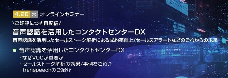 トランスコスモスではその解決策の一つとして、音声認識を活用して音声データを分析し、セールストークに活用することで成約率向上を実現しました。本セミナーでは、トランスコスモスが開発した音声認識導入から運用・分析までトータルに支援する音声認識ソリューション「transpeech」の機能をご紹介します。