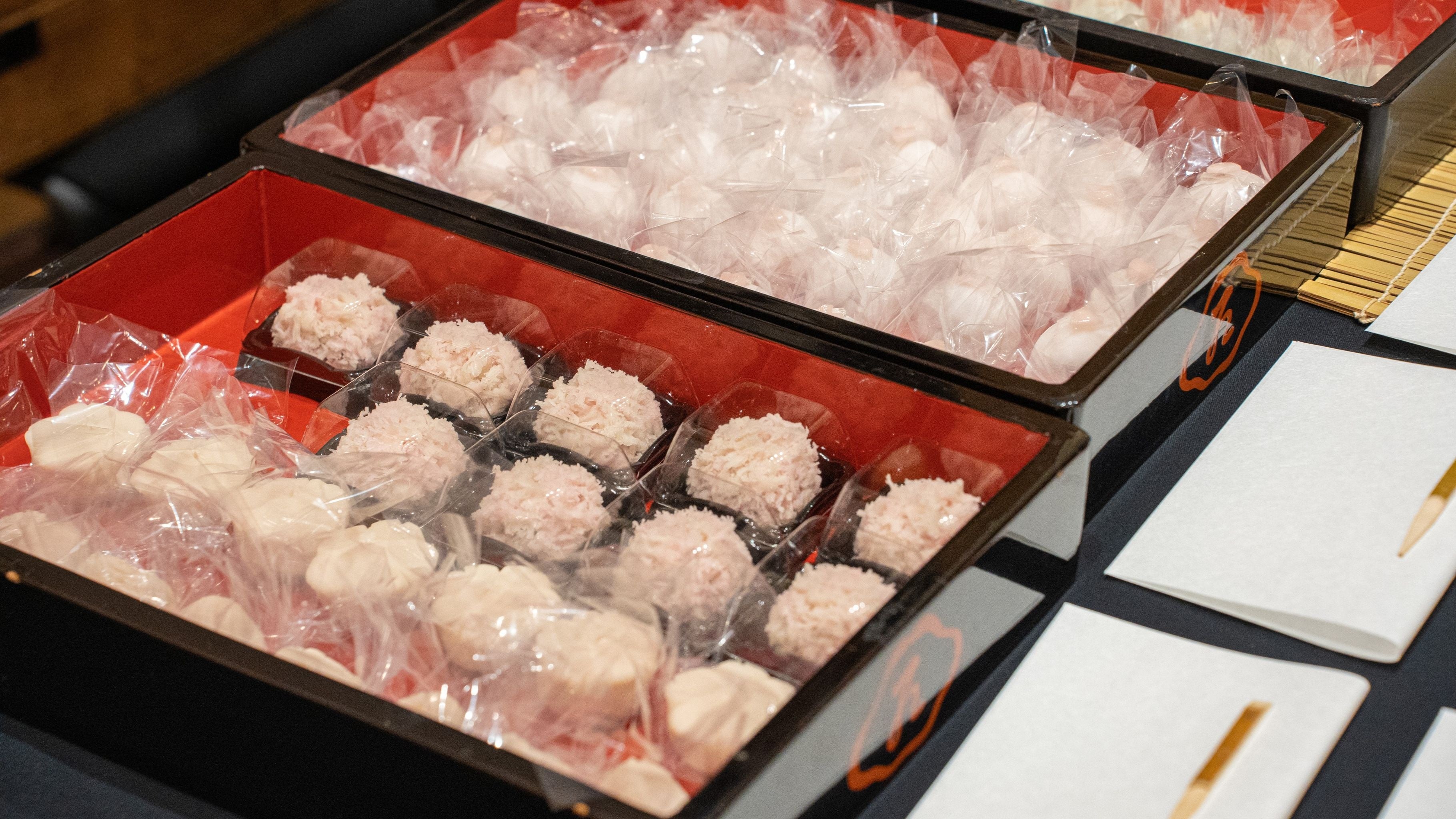 1つ目は、和食文化の原点とも言われている「おにぎり」を、「出張ほぐれおにぎりスタンド」に出張出展いただきました。塩、大葉しょうゆなど、ビーガンも考慮した5つの味のおにぎりを、各国代表団の目の前で1つ1つ握り、説明とともに提供。スタンドの前には長蛇の列ができるほど大きく盛り上がりました!