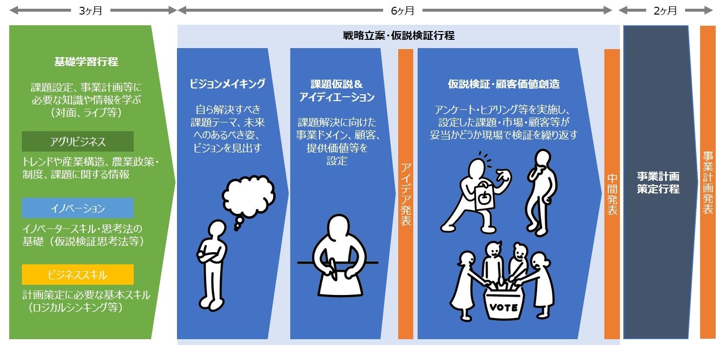 本アカデミーはアグリビジネスでの価値創造や課題解決を通して世の中や農業界をより良く変革する人材を輩出するものである。従って、教育は価値創造や課題解決に向けたイノベーションの型を身に付ける事を主眼とし、戦略立案・仮説検証行程を軸とした、3つの行程をもって構成する。