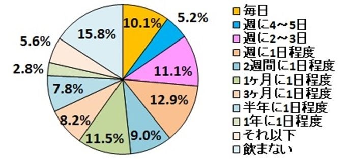 炭酸飲料を飲む頻度は、「週に1日程度」が最も多くて、12.9%。「毎日」飲む人も10.1%と比較的多いですね。