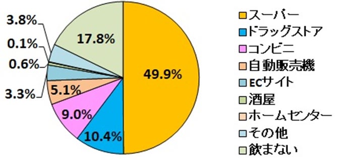 購入する場所は「スーパー」が49.9%と、ほぼ半数。2位の「ドラッグストア」は10.4%と10人に1人の割合です。昔は多かったと思われる「酒屋」は0.6%にすぎません。