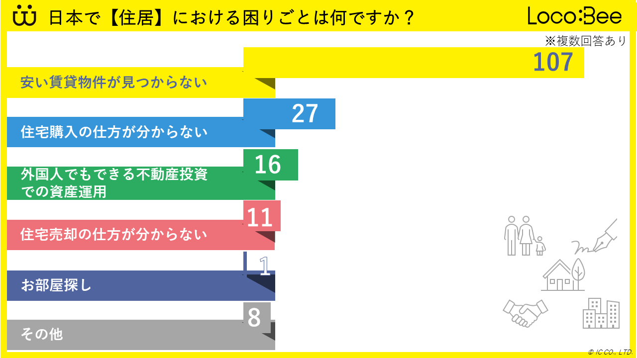 回答者の属性や回答結果からみても、安い賃貸物件を探している在留ベトナム人が多いことが分かります。それに比べると割合が少ないですが「住宅購入」や「不動産投資」など、日本での将来を見据えて生活している方もいるようです。