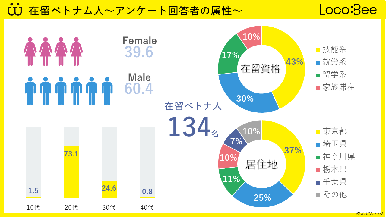 今回は、在留ベトナム人が集まるイベント「ベトナムフィスティバル2022」(開催地:代々木公園)でアンケート調査を実施した為、都内近郊在住の20代が一番多く回答。その中でも、70%以上が「技能実習制度」「就労」でビザ取得をし滞在していることが分かります。