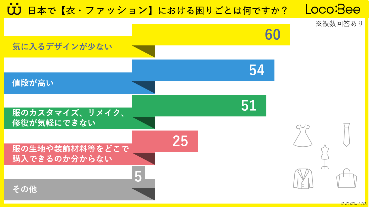 昨今は物価の上昇もともない、更に「値段が高い」という意識は高まっていると想定していましたが、それを上回り「気に入るデザインが少ない」という回答が1位でした。環境、気温、文化・流行の違いがあると思われますが、個別に数名に確認したところ、ベトナムでは、3位、4位にあるように、“服のカスタマイズ、リメイク、修復”が、安価で気軽にできるお店が多いようです。