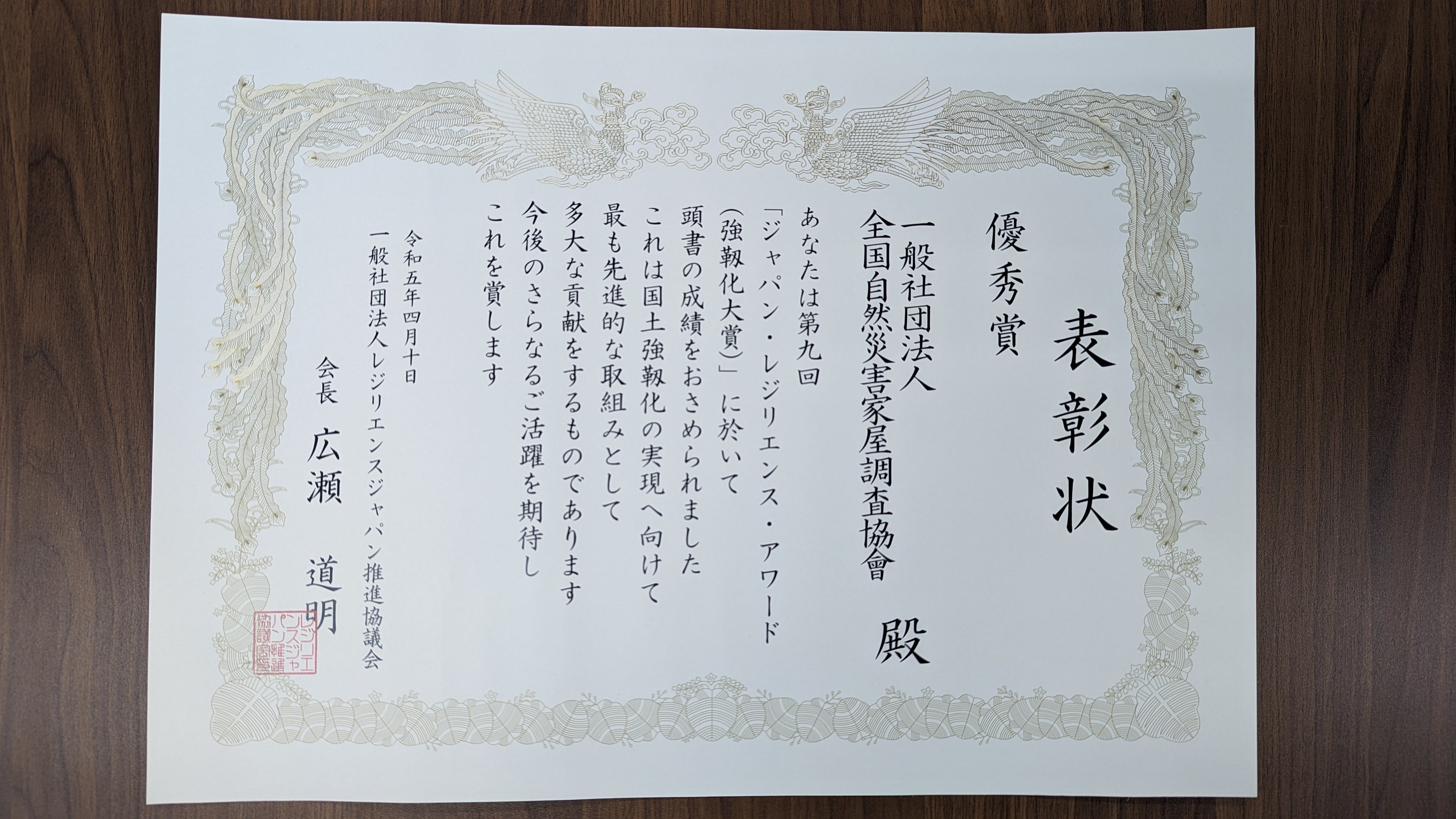 当協会は「住家被害認定調査」に関する知識や技術を継承するため、これまで「住家被害認定士2級」の資格発行を行っておりましたが、新たに「住家被害認定セミナーの開催」や「講師の育成」にも取り組んで参りました。この度、この取り組みが「強くてしなやかな国づくり、地域づくり、人づくり、産業づくりに資する」との評価をいただきました。本アワードの受賞を踏まえ、当協会は今後も大規模災害発生時の官民連携および迅速な復興を目指して活動して参ります。