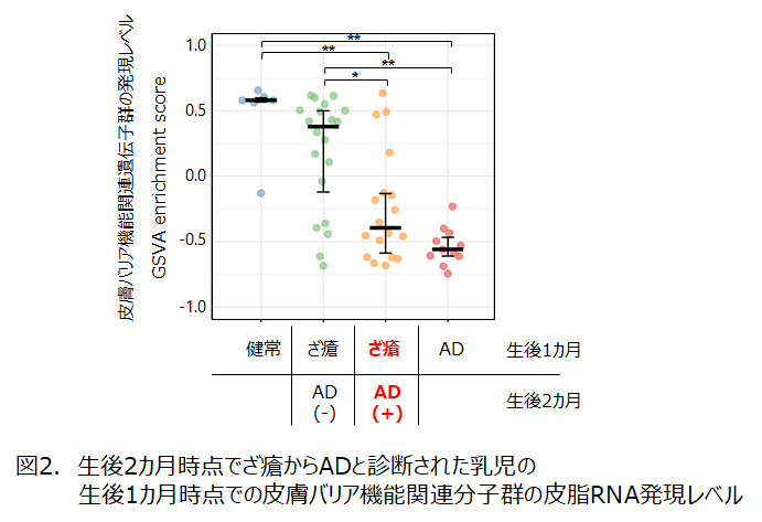 その結果、早期発症型ADの乳児の皮脂RNAは、健常皮膚の乳児(以下、健常児)と大きく異なり、皮膚バリアに関わる分子の発現が低いなど、ADの特徴を明確に有していることを明らかにしました。さらに、生後1カ月時点でざ瘡(ニキビ)の症状があり、生後2カ月目でADと診断された乳児では、ADを発症する1カ月前から既にADと類似する皮脂RNAの特徴を有することも見いだしました。