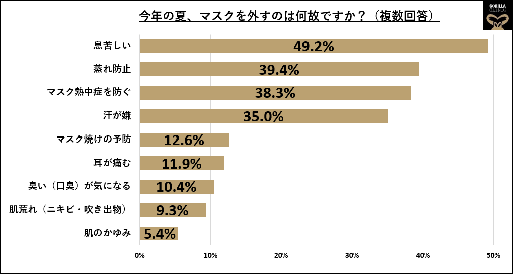 - ③【マスクを外す理由とは?】全世代トップで「息苦しい(49.2%)」と回答。次点「蒸れ防止(39.4%)」が続く