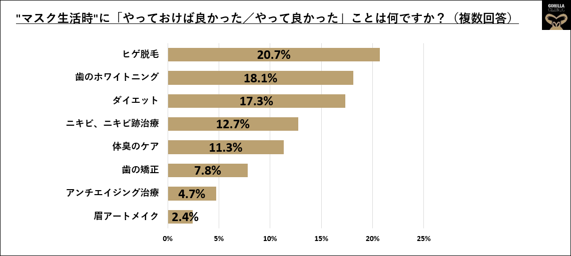 - ⑦【マスク生活中「やっておけば良かった/やって良かった」こと】①ヒゲ脱毛②歯のホワイトニング③ダイエット