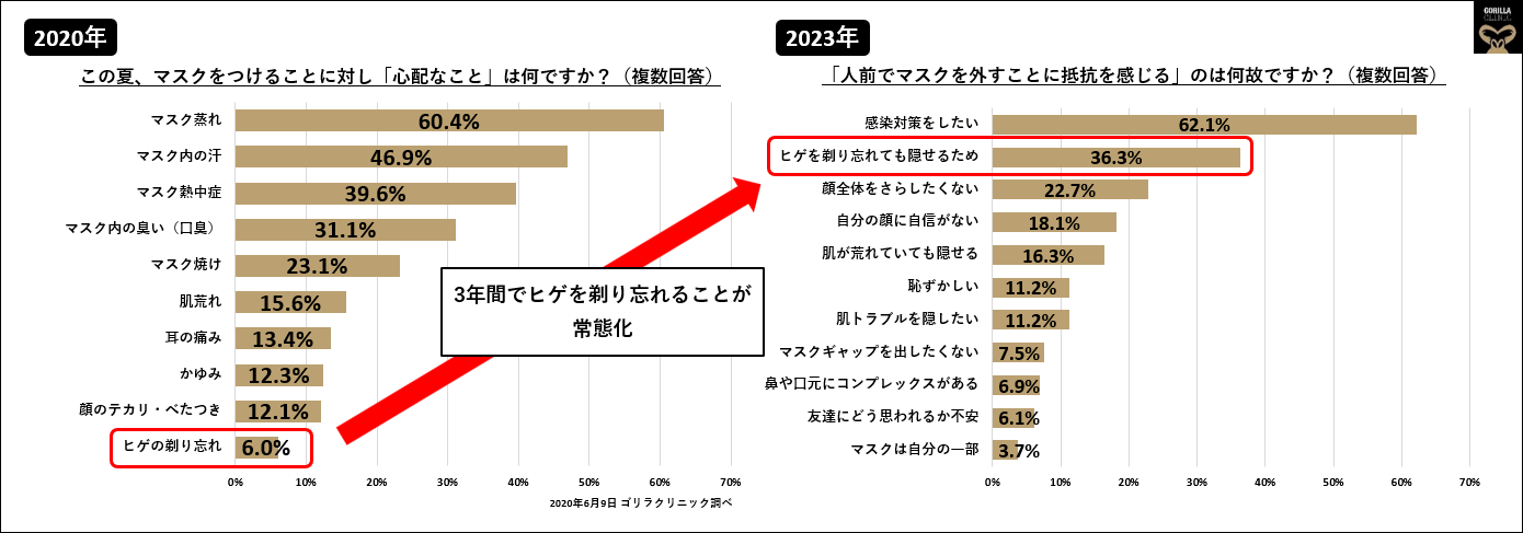 ◎2020年の調査と比較: 2020年の回答では「ヒゲの剃り忘れ」は6.0%だったが、常態化し伸長。今回の「脱マスク」では4割が回答するなど心配ゴト化へと変化