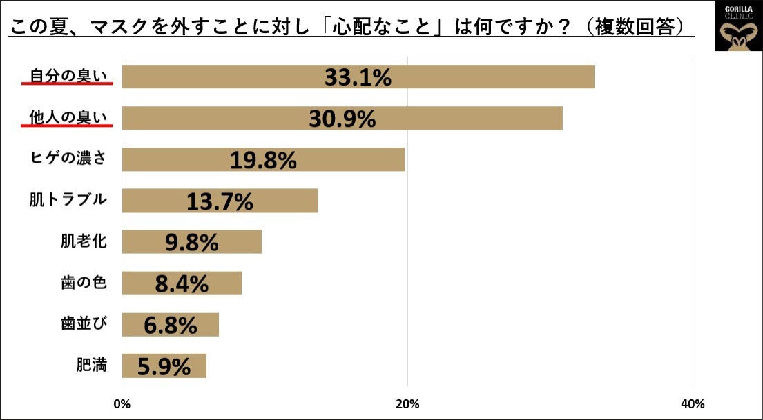 【この夏、マスクを外すことに対し「心配なこと」は何か?】の問いには、トップ2に「臭い」関連がランクイン。3位「ヒゲの濃さ」、4位「肌トラブル」、5位「肌老化」をおさえ、1位に「自分の臭い(口臭や体臭)33.1%」、2位に「他人の臭い(口臭や体臭)30.9%」と、男性たちは【自他の臭いを気にしている】ことが判明しました。