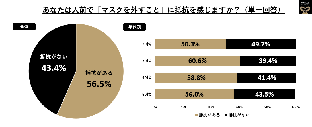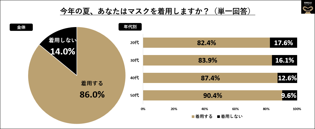 そこで、男性専門の総合美容クリニック『ゴリラクリニック』(医療法人社団十二会・新宿区 総院長:稲見文彦)は、2023年4月4日~5日の2日間、20~50代の男性ビジネスマン666名を対象に【世代別「2023年/夏のマスク着用に関するアンケート】を実施しました(インターネット調査)。