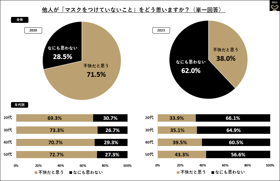 なお、【マスク未着用者への不快感】については、3年前のコロナ初期は男性の7割が「不快」としていたマスクの未着用者は、今回の2023年4月の調査では4割と、3年で3割(33.5%)減少したことが分かりました。