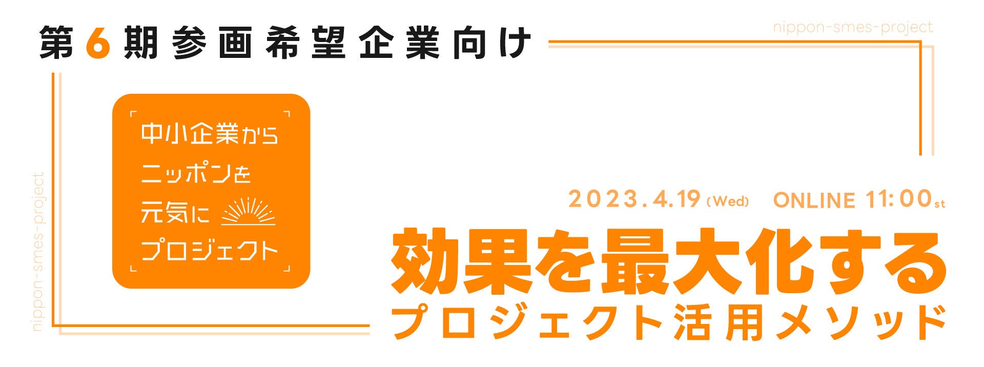 2023年7月から開始する第6期「中小企業からニッポンを元気にプロジェクト」に向けて、新規参画企業の募集が今月からスタートいたしました。 そこで今回は累計680社以上のの事例から、効果を最大化させるプロジェクトの活用方法について、お話しいたします。
