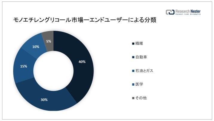 エンドユーザーに基づいて、世界のモノエチレングリコール市場は、繊維、自動車、石油とガス、医療などの需要と供給について分析されています。これらのセグメントのうち、繊維セグメントは、2033 年末までに最高の市場成長を維持すると予想されています。このセグメントの成長は、モノエチレングリコールの製造の増加を開始した繊維部門でのポリエステル繊維の需要の増加と相まって、世界中で動的に急増する繊維需要に起因する可能性があります。たとえば、世界の繊維部門は 2022 年に約 1.6 兆米ドルと評価されており、今後数年間で毎年 4 ー 5% の割合で拡大すると予想されています。
