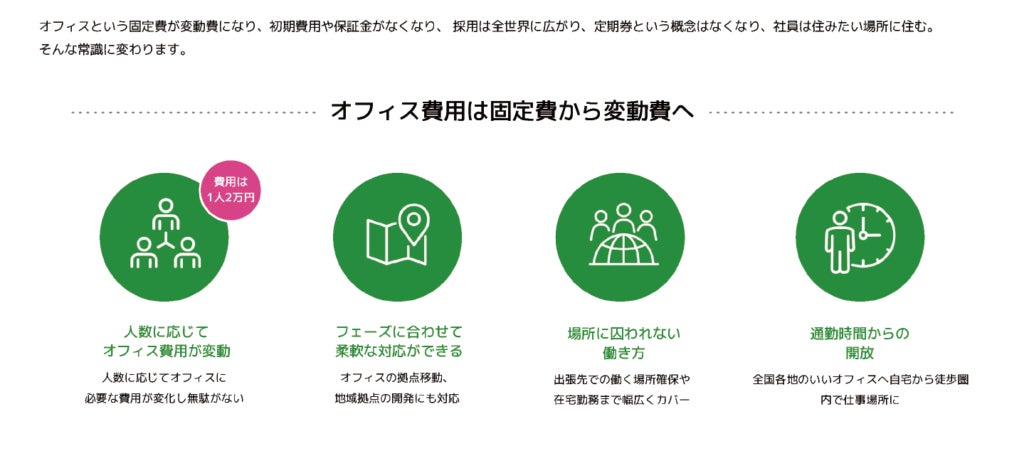 現在は首都圏を中心に、国内外で800店舗以上を展開する定額制コワーキングスペース。店舗数は日本一で、契約ベースで1,100店舗を超えており、働く人が快適に働ける環境をつくり、場所にとらわれない、多様な働き方のサポートをもたらすため、事業を展開している。