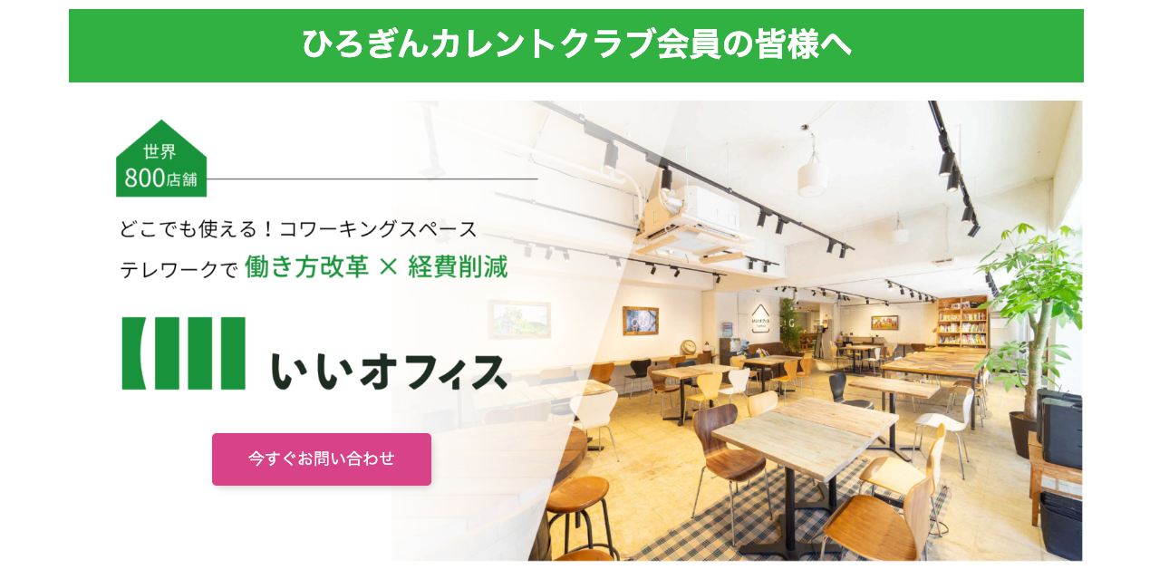 広島銀行が、旧ひろぎん経済研究所の会員組織を受け継ぐこととなり、会員サービスの充実を検討していた際、都市部でニーズのあるコワーキングスペースの提供をサービスとして加えることとなりました。そこで、業界大手の「いいオフィス」にトレジャーコンテンツを介して提携の相談を行ったことがきっかけとなり、本業務提携とひろぎんカレントクラブ会員限定の「いいオフィス」特典付きサービスの提供が実現しました。