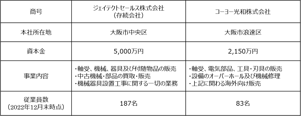 株式会社ジェイテクト(本社:愛知県刈谷市、取締役社長:佐藤和弘、以下「ジェイテクト」)の国内グループ会社であるジェイテクトセールス株式会社およびコーヨー光和株式会社の両社は、2023年7月1日付(予定)で合併いたします。
