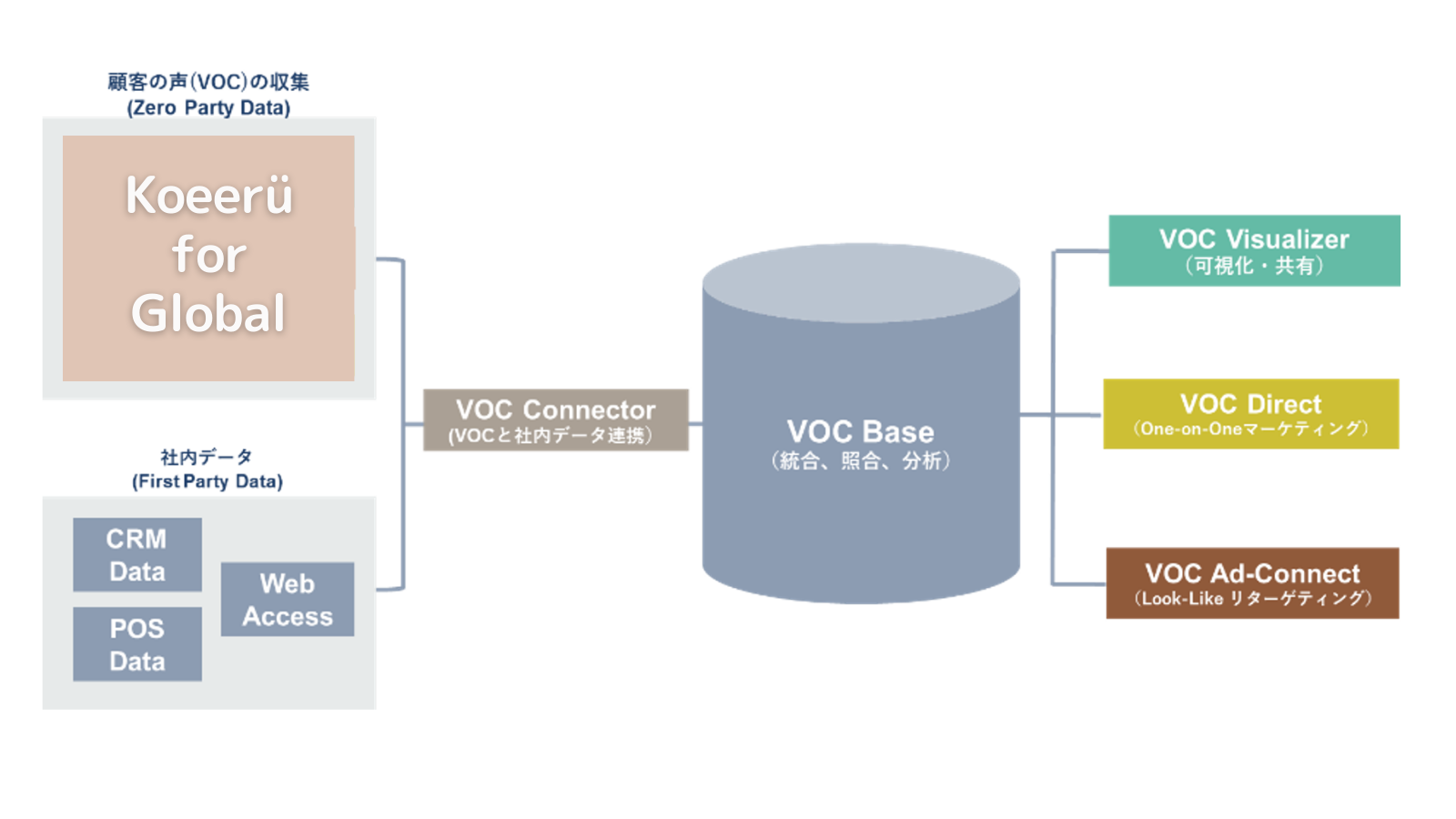 - グローバルリサーチから顧客データ基盤構築:Koeeruが開発するVOCプロダクトを組み合わせることで、「自社のタッチポイントを活用したVOCの収集」「ファーストパーティデータとの連携」「リサーチ結果を可視化するダッシュボードの構築」など、自社のタッチポイントの有無にかかわらず、より広範囲のVOCを対象とするデータプラットフォームを構築することができます。