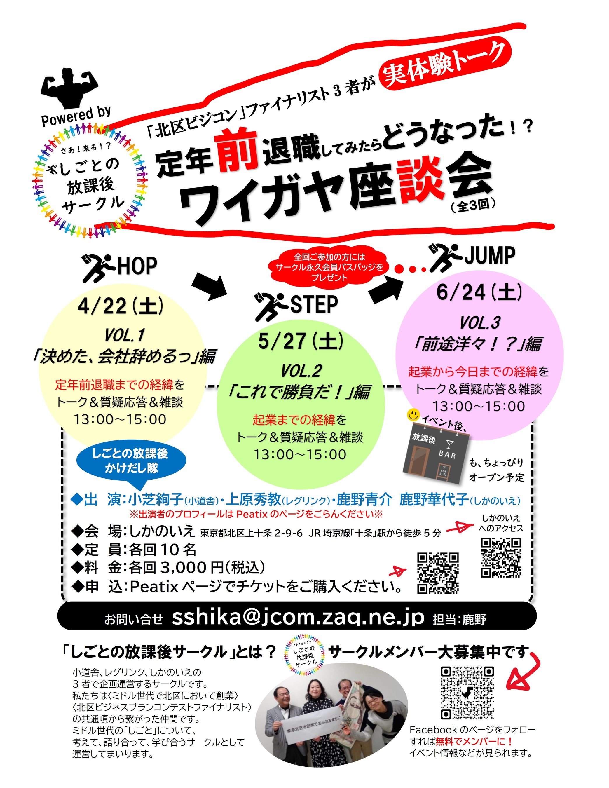 40代、50代で定年前退職をして起業した我々「しごとの放課後サークル」メンバーの経験を元に、「定年前退職までの経緯」「起業までの経緯」「起業から今日までの経緯」を3日に分けて、雑談を交えながら紹介し、ミドル世代の働き方について参加者の皆様とと一緒に語り合う会を開きます。