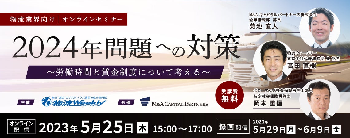 物流業界の労働時間管理や賃金制度の大幅な見直しがなされる「2024年問題」。この変革の時、企業としてどのような対応が求められるのかを、特定社会保険労務士の岡本氏をゲストにお招きをしてお話しいただきます。後半では、物流業界のM&A実績で国内トップクラスの実績を誇る当社M&Aアドバイザー菊池が、物流業界におけるM&Aの実態を解説。M&Aを活用した事業成長と事業承継の事例と共に、M&A成功のポイントをお届けいたします。