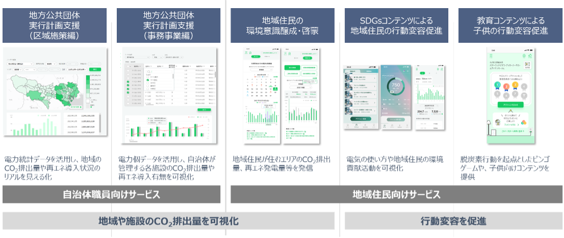 本サービスは、脱炭素先行地域をはじめとする脱炭素関連事業や街づくりといった事業に取り組む自治体に向けて、実数値に基づく地域のCO2排出量(電気由来)や電力需給状況を把握、実態に即した計画策定・施策実行の推進に加え、脱炭素行動が求められる地域住民の行動変容、行動定着化に必要となる各施策の実現をサポートするサービスコンテンツをSaaS型(注2)で提供するものです。