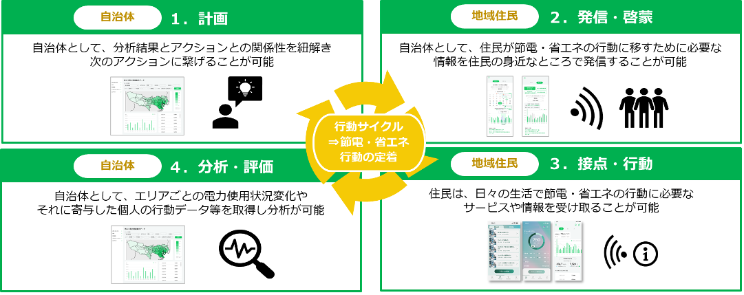 GDBLでは、多くの自治体と意見を交わす中で、地域の脱炭素化を達成するためには、地域住民の生活に節電・省エネ行動が定着することが重要と考え、行動変容を意識づける脱炭素化支援に向けた総合サービスを開発しました。