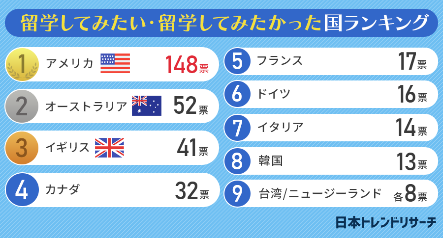 今回は、株式会社インターナショナルアドミッションズセンターと共同で、事前調査で「留学をしたことがない」と回答した全国の男女400名を対象に「留学してみたい・留学してみたかった国」についてのアンケートをおこないました。