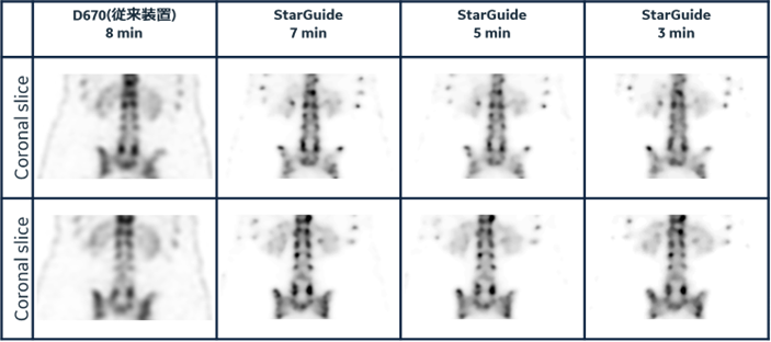 がんの治療における放射性医薬品内用療法には177Luが用いられることがありますが、その投与量が多いことで従来のSPECT/CT装置では数え落としが発生し、中エネルギー帯であることから半導体であっても208keVのエネルギーを収集することが難しいとされてきました。StarGuideは270keVまでのエネルギーに対応することで、従来のSPECT/CT装置よりも数え落としを圧倒的に少なくし、コリメータを交換せずに177Luにおける113keV, 208keVの双方のエネルギーを収集することが可能になりました。画質、定量精度を向上させることで、Theranosticsにおける予後予測、治療における正常臓器への影響をより正確に導き出すサポートを行います。