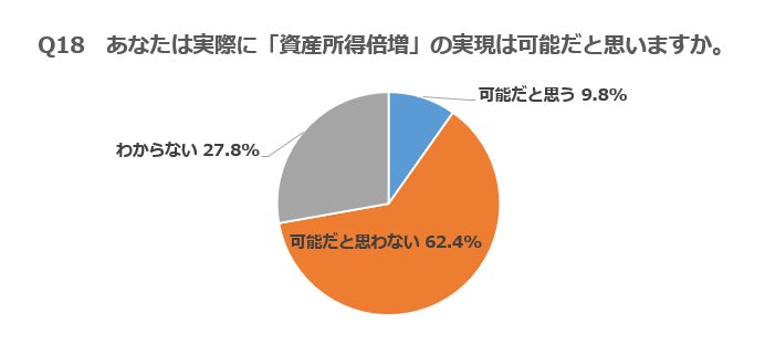 - 実際に資産所得倍増が「可能だと思う」は9.8%だったのに対し「可能だと思わない」は62.4%に達した。年代別に見ると、「可能だと思う」は40代以下の層で相対的に多く、いずれも1割を超した。これに対し50代以上は全て1割未満だった。「可能だと思わない」は30~60代で相対的に多く、いずれも6割を超した。(Q18、調査結果詳細を含む)
