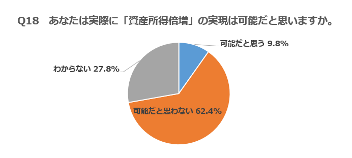 - 実際に資産所得倍増が「可能だと思う」は9.8%だったのに対し「可能だと思わない」は62.4%に達した。年代別に見ると、「可能だと思う」は40代以下の層で相対的に多く、いずれも1割を超した。これに対し50代以上は全て1割未満だった。「可能だと思わない」は30~60代で相対的に多く、いずれも6割を超した。(Q18、調査結果詳細を含む)
