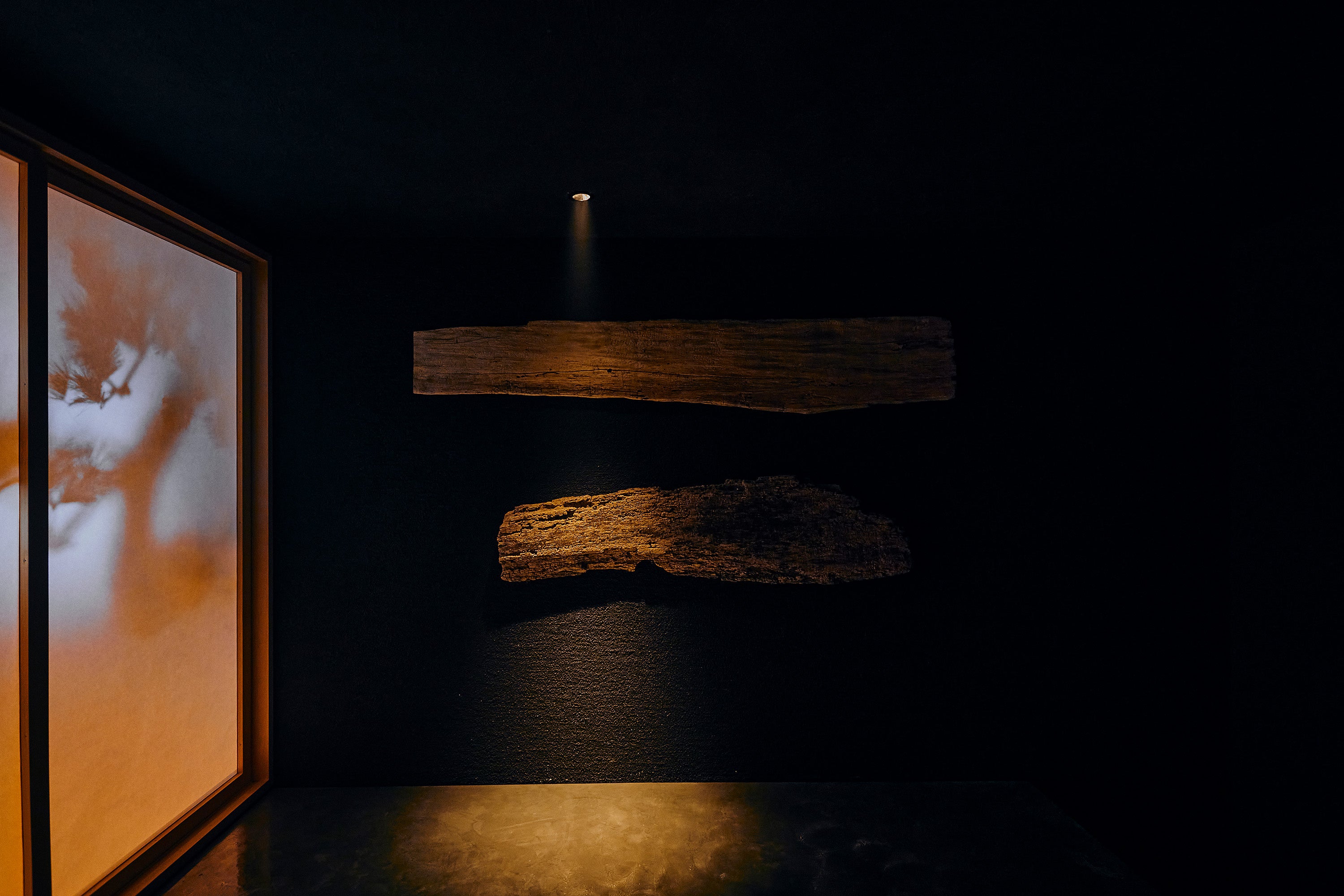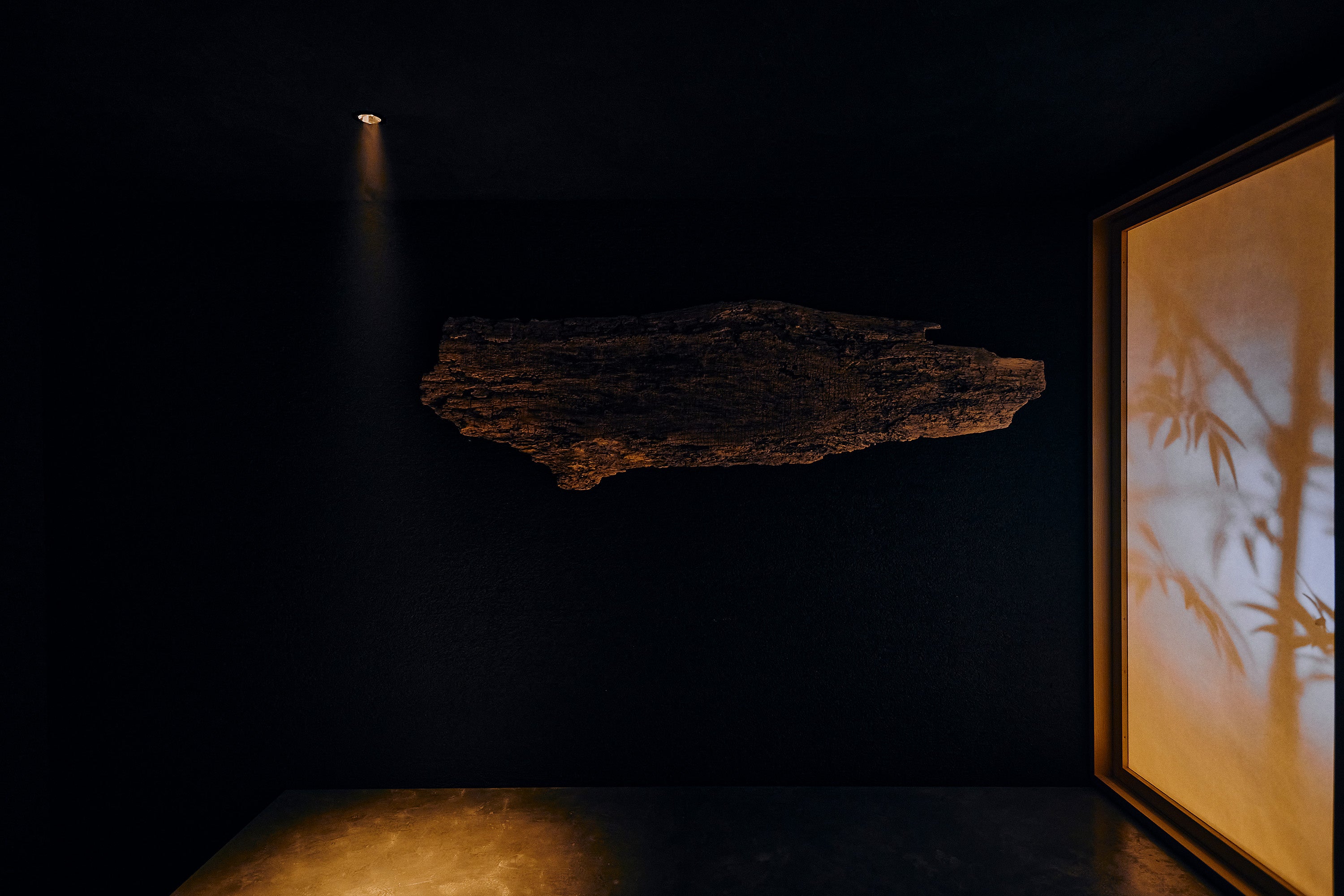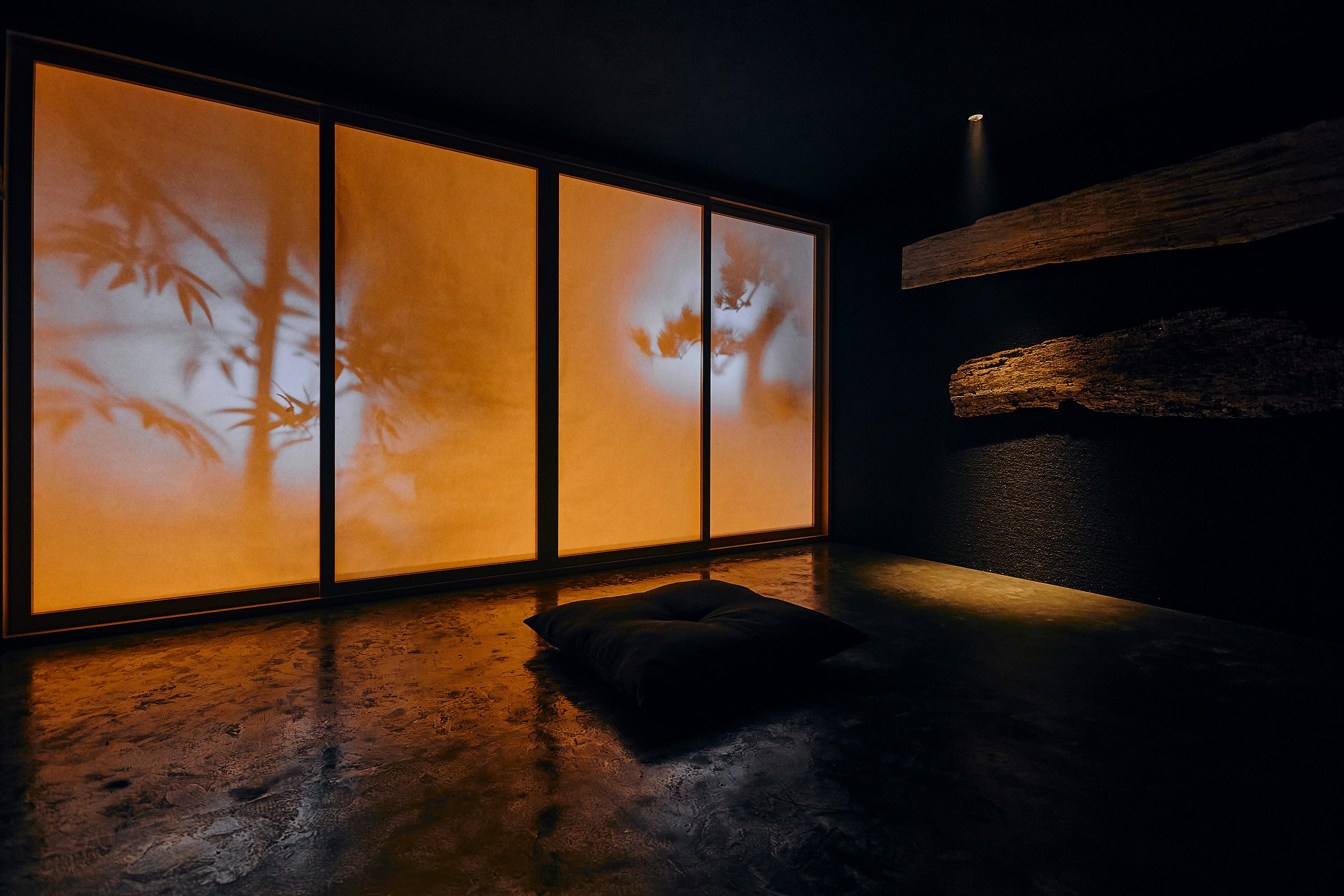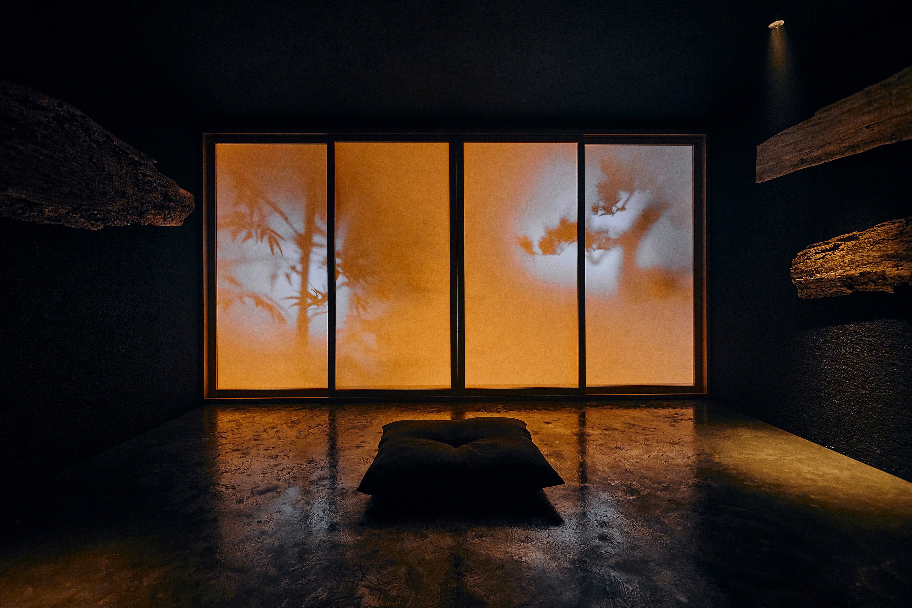 来場者は天板の上に上がり、実際に座ることができます。空間全体はスモークで靄がかった空間で、正面の障子の色や輝度は日付や時間によって移り変わっていきます。壁面には長い時を感じさせる古木。薄く流れるアンビエント音楽も相まって、都会の喧騒を忘れる空間作品となっています。