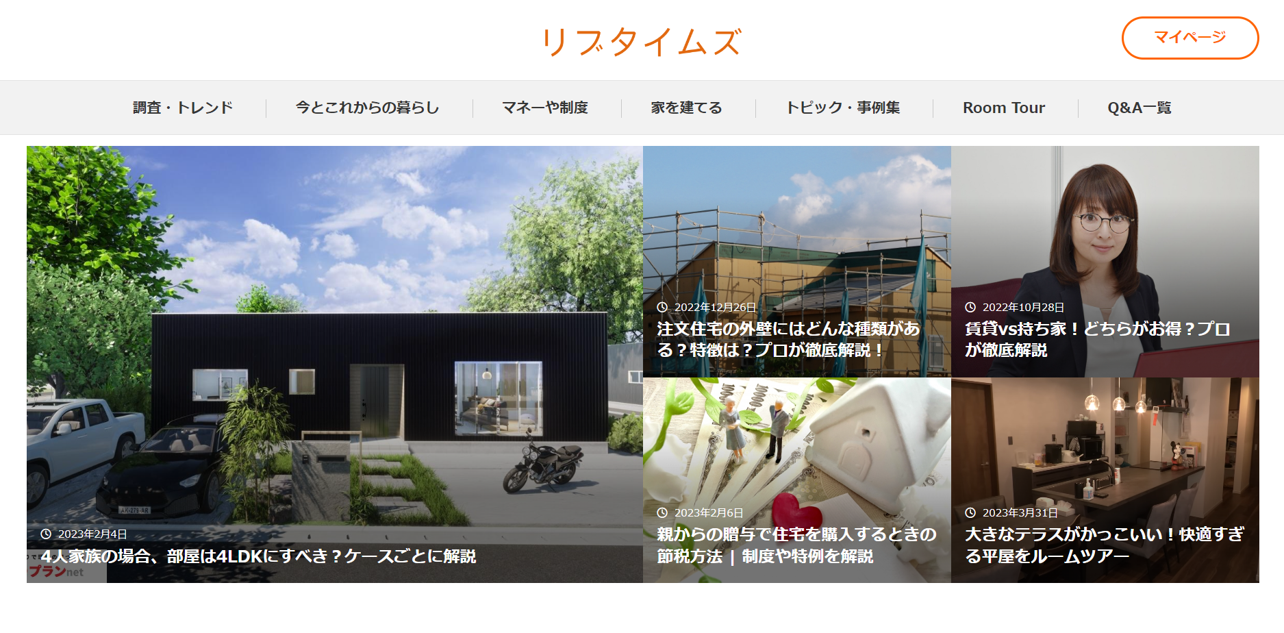 リブタイムズのカテゴリーは「調査・トレンド」「今とこれからの暮らし」「マネーや制度」「家を建てる」「トピック・事例集」「Room Tour」「Q&A一覧」の7種類と多岐にわたっています。