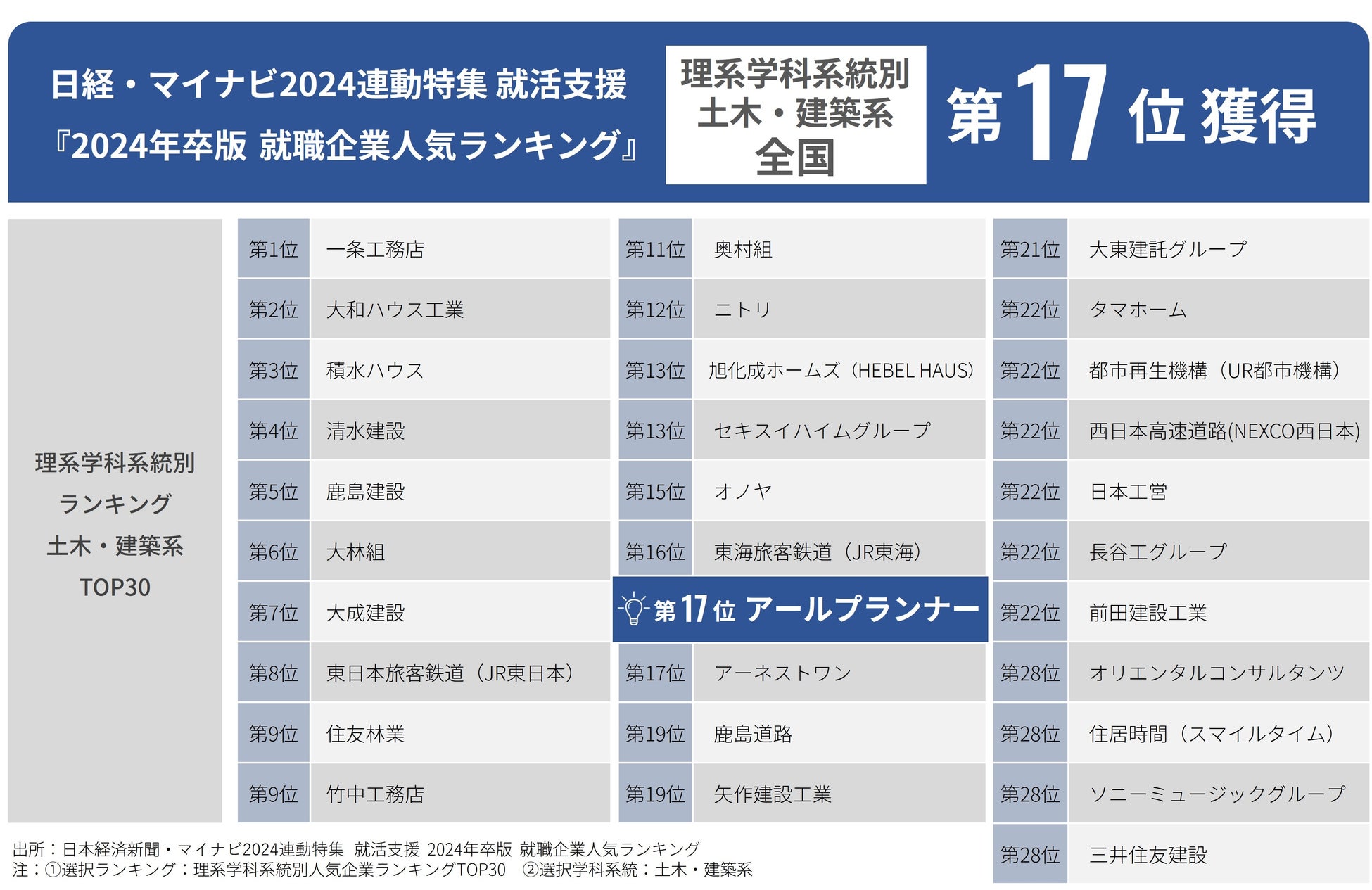 戸建住宅を中心とした住宅プラットフォーム事業を展開する株式会社アールプランナー(本社:名古屋市東区、代表取締役社長:梢 政樹、以下「当社」)は、日本経済新聞社と株式会社マイナビが発表した2024年3月卒業・修了見込みの全国の大学3年生、大学院1年生を対象に行った就職希望企業調査において理系学科系統別の人気企業ランキング『理系学科系統別 土木・建築系』で全国17位に選出されました。