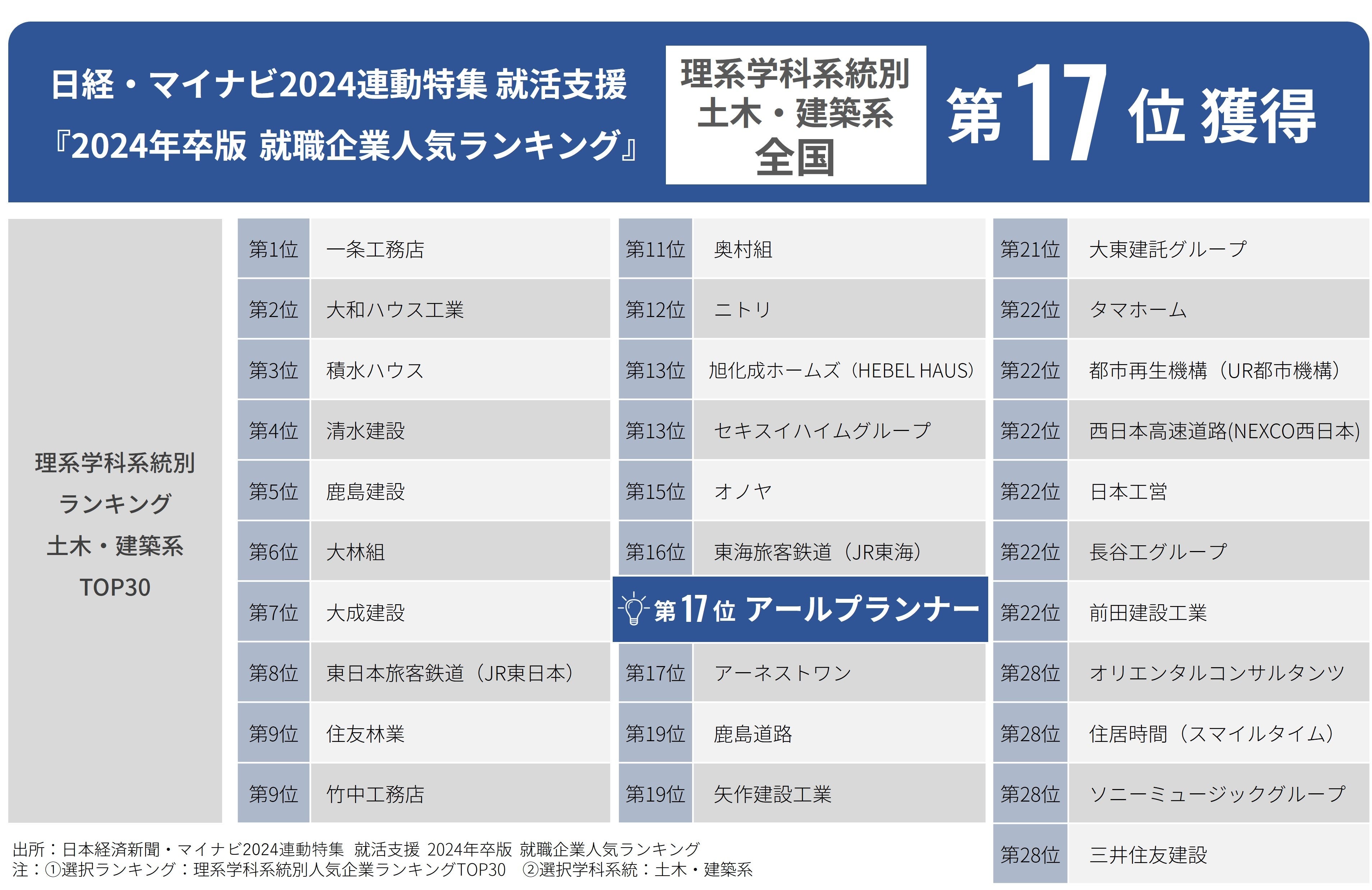 当社は、日本経済新聞社と株式会社マイナビが発表した『2024年卒版就職企業人気ランキング』において、理系学科系統別の人気企業ランキング『理系学科系統別 土木・建築系』の全国17位に選出されました。理系学科系統別での選出は初めてとなります。