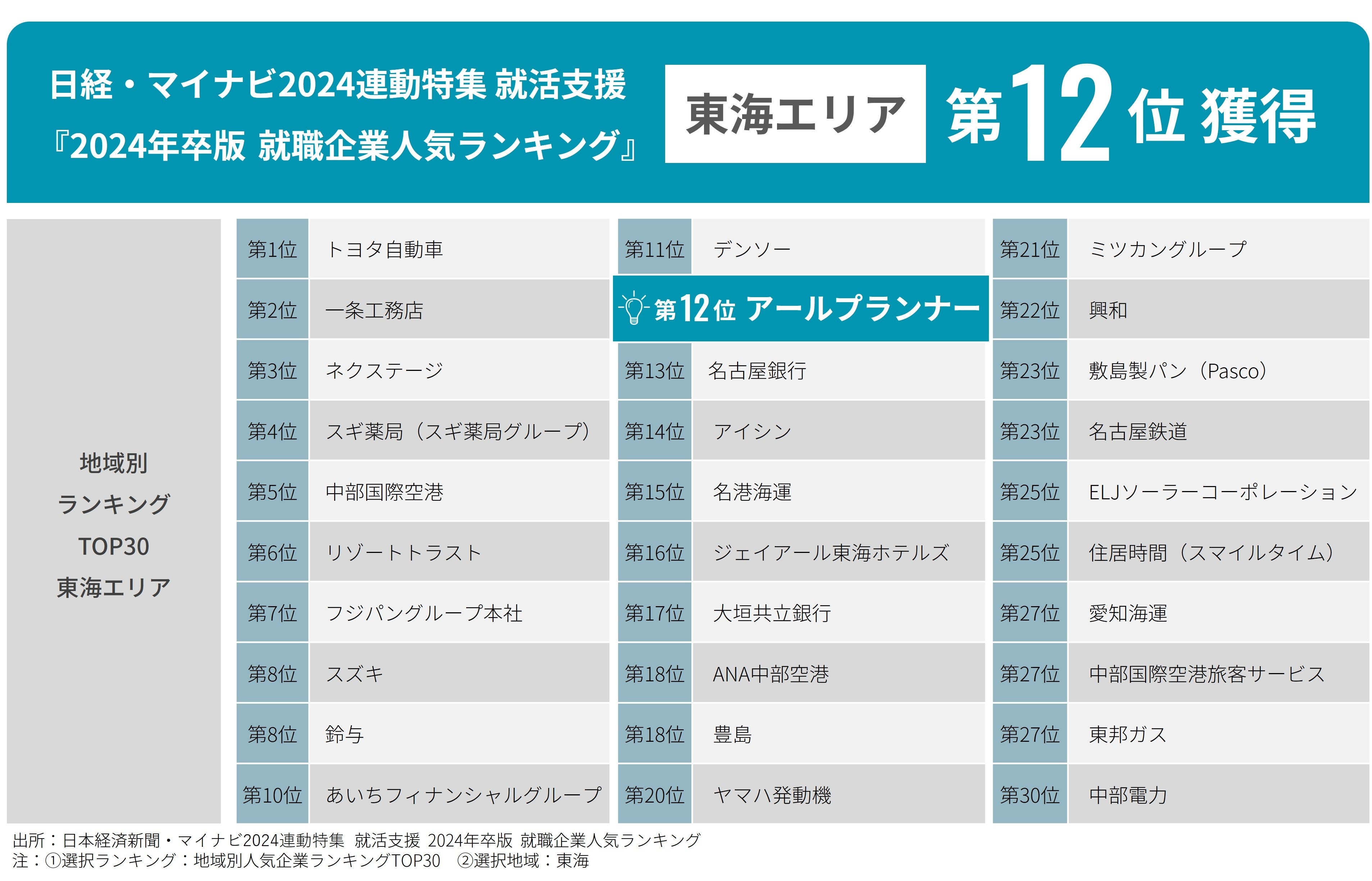 また、『地域別ランキングTOP30・東海エリア』の人気企業として12位に選出されました。地域別では昨年の15位に続き、ランクアップしての選出となりました。