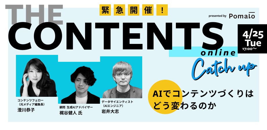 2回目となる今回は、ChatGPTの登場により世の中が大きく変化する今、「AIでコンテンツ作りはどうかわるのか」をテーマに、「AIを活用したコンテンツ制作の可能性と限界」「人間とAIライターとの比較」などについて、Pomaloに在籍している各分野のトップランナー達が本音で語る必見イベントです。このイベントは、AI技術の進化によってもたらされるコンテンツマーケティングの未来をいち早く見据えことで、コンテンツ制作業界全体の発展に貢献することを目的としています。