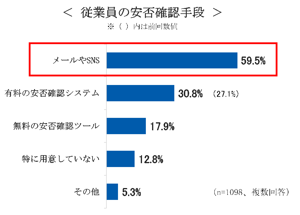 東京商工会議所が実施した、会員企業の防災対策に関するアンケート2022年調査結果(東京商工会議所 災害対策委員会調べ)、によると、従業員の安否確認手段はメールやSNSが最多となっています。