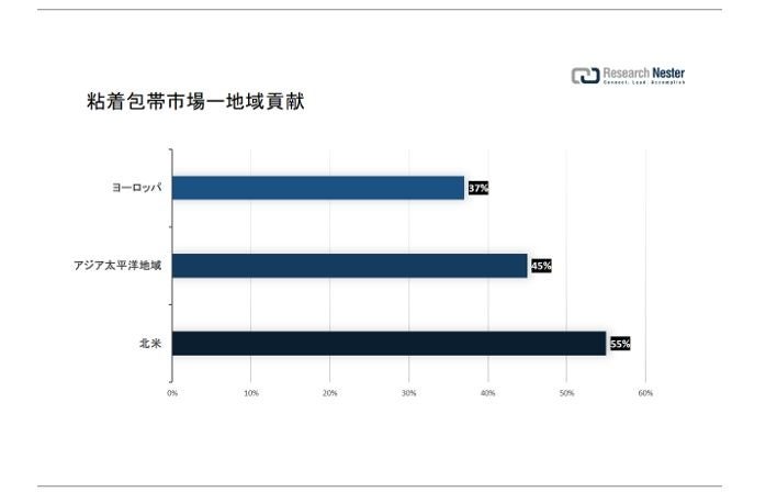 流通チャネルに基づいて、病院および診療所セグメントは、予測期間にわたって最大のシェアを保持すると推定されています。これは、負傷患者の病院への緊急入院の増加と、病院や診療所でのより優れた慢性創傷ケアと応急処置の利用可能性を背景にしています。たとえば、米国では、2018 年にけがに関連して病院の救急部門を訪れた回数は、最大で 34百万回に達しました。事故や労働災害の増加に伴う緊急事態の増加は、体の臓器や組織に慢性的な損傷を引き起こします。 慢性的な怪我は、傷の完全な回復のために長期的なケアを必要とするため、これは粘着包帯市場の使用を増加させると推定されています。また、軽度の切り傷や怪我を含む、家庭や職場での作業中の偶発的な怪我は、絆創膏で治療されます。