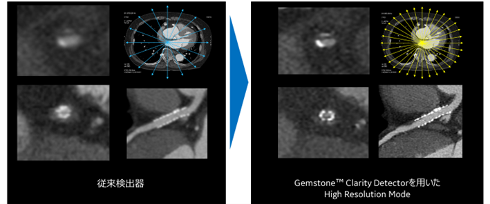 画像診断機器におけるCT装置の優位性の一つとして、高い空間分解能があります。本製品はCT装置がもつ高い空間分解能のさらなる向上を追求し、High-Resolutionモードを搭載しています。本製品では、一般的なCT装置に用いられる個体検出器に比べて、100倍近い応答速度(プライマリースピード)と1/4の残光特性(アフターグロー)を有するGemstone™ Clarity Detectorを搭載していることから、秒間8914viewのサンプリングを実現、そしてX線焦点を偏向させながら従来比約2.5倍のデータを収集し画像再構成をすることで、空間分解能を向上させることが可能です。全身領域で高精細な画像提供が可能であり、微細構造をもつ部位においても、確信度の高い診断を支えます。