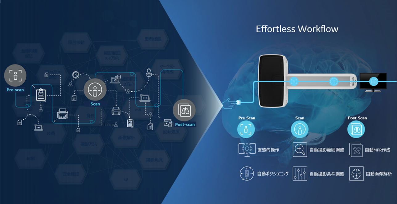 CT装置は患者ごとに異なる体格や検査内容等、1検査・1患者ごとのニーズに応える必要があります。また、医療現場ではこれらの検査を短時間で、正確に、かつ患者への負担を最小限に抑えることが求められます。本製品ではCT検査のPre-Scan、Scan、Post-Scanの各工程において人工知能AI技術ならびに自動化技術を活用し、患者一人ひとりに最適な検査を提供することで個別化医療の前進に貢献します。
