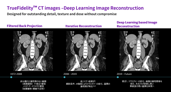 本製品では、GEヘルスケアの40年以上のCT開発の歴史の中で培った画像再構成のノウハウ・膨大な画像データの中から、日本を含めた世界中の専門医からのフィードバックにより、最も診断しやすいとされた条件・画像データをGround Truth(教師画像)に採用し、ディープラーニングを用いて開発されたDeep Learning Image Reconstruction法TrueFidelity™ Imagingを搭載。空間分解能・画質を維持しながら、高いノイズ低減を実現し、特に頭部、腹部領域など密度分解能が重要とされる領域での読影負担軽減、診断能向上が期待できます。