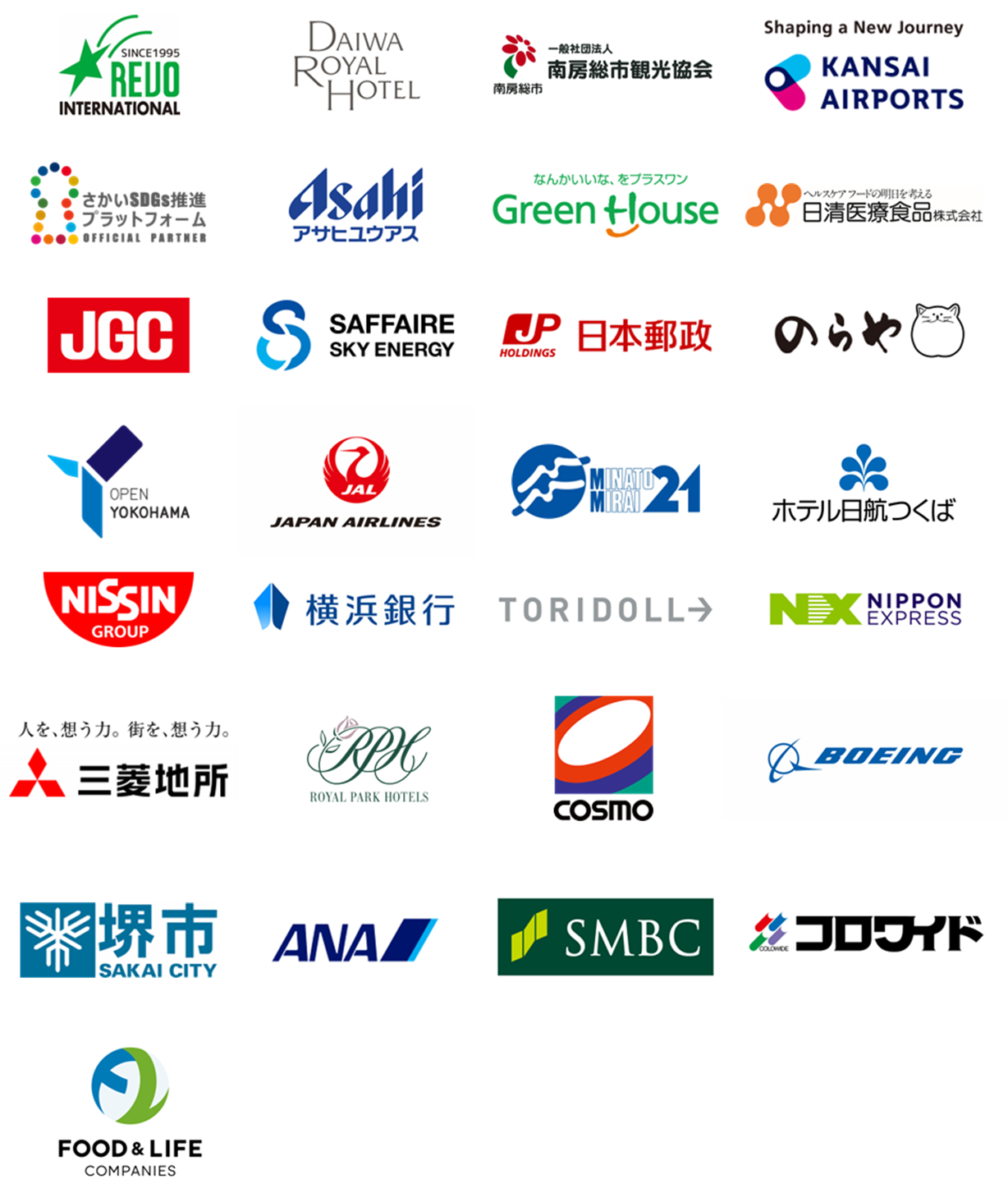 株式会社レボインターナショナル、大和リゾート株式会社、一般社団法人 南房総市観光協会、関西エアポート株式会社、さかいSDGs推進プラットフォーム、アサヒユウアス株式会社、株式会社ジーエスエフ、日清医療食品株式会社、日揮ホールディングス株式会社、合同会社SAFFAIRE SKY ENERGY、日本郵政株式会社、株式会社のらや、横浜市役所、日本航空株式会社、一般社団法人 横浜みなとみらい21、ホテル日航つくば(株式会社筑波学園ホテル)、日清食品ホールディングス株式会社、株式会社横浜銀行、株式会社トリドールホールディングス、日本通運株式会社、三菱地所株式会社、株式会社ロイヤルパークホテルズアンドリゾーツ、コスモ石油株式会社、ボーイングジャパン株式会社、堺市、全日本空輸株式会社、株式会社三井住友銀行、株式会社コロワイド、株式会社FOOD & LIFE COMPANIES